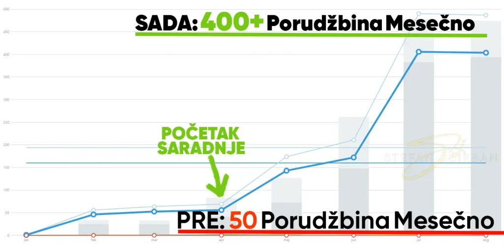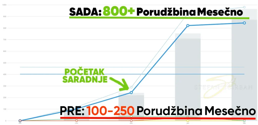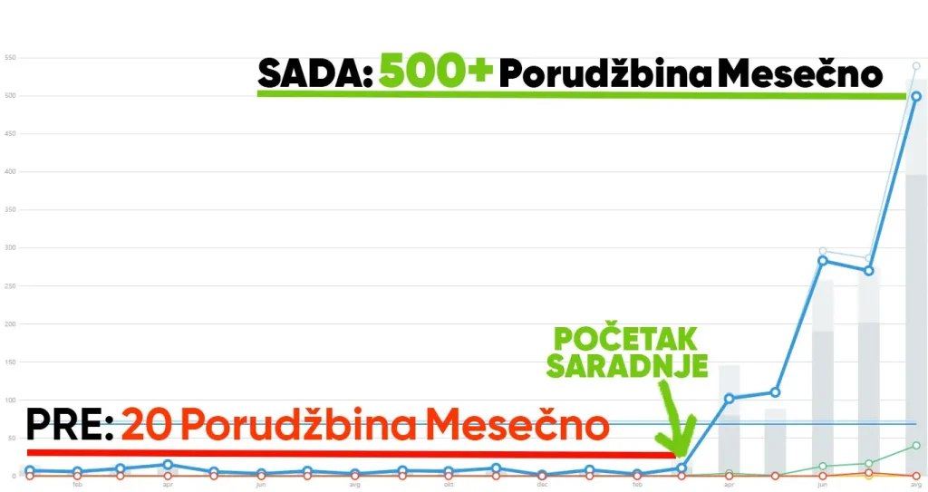 Ako imaš validan proizvod i osnovne tehničke uslove (sajt, sistem naplate, itd.), klijenti najčešće vide prve konkretne pomake već u prva 2–3 nedelje. Ne nudim čuda, ali nudim dokazan sistem koji je skalirao prodaje i do 5x u roku od 2 meseca.